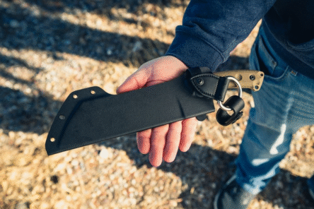 Given that even in this smaller iteration the Lil Chete is a full fat chopper, the handle is appropriately roomy, with the same general profile as the original. Micarta scales are attached onto the full tang handle, and for the other kind of carry TOPS has included a Kydex sheath with a leather dangler loop attachment. The Lil Chete, with the sheath, weighs 29.1 oz.