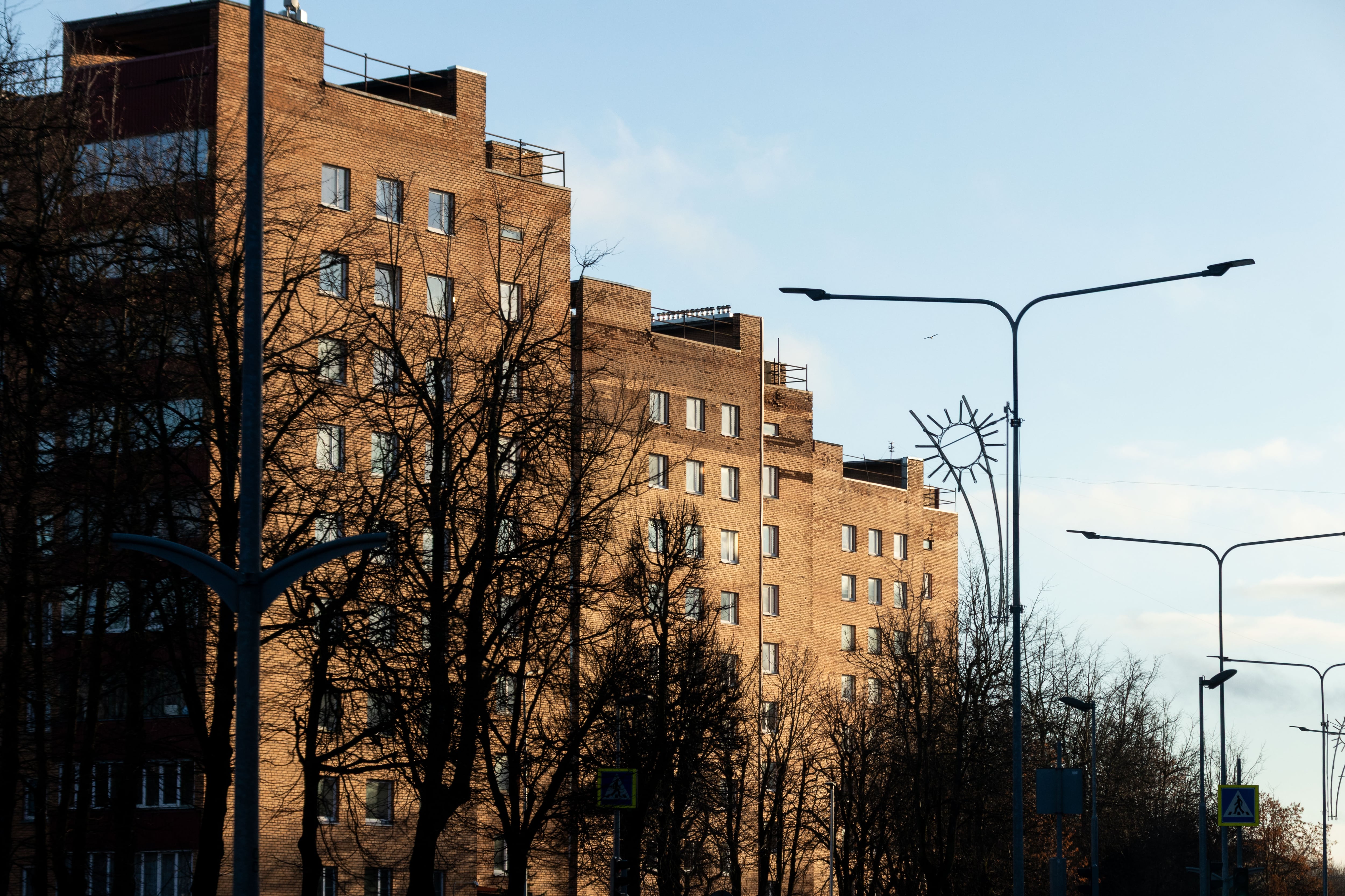 On the Soviet-built House of Culture in Sillamäe, a grand Stalinist building, hangs a conspicuous sign featuring a blue triangle on an orange base. Scattered around Estonian towns, this sign marks that the building has a publicly accessible bomb shelter. The symbols started appearing in June 2022 as a direct consequence of Russia’s invasion of Ukraine and the fears it caused in Estonia. Within six months, shelter spots for more than 60,000 residents were marked accordingly. In the case of war, they would seek refuge in World War-era citadels, parking lots, and under schools and hospitals.