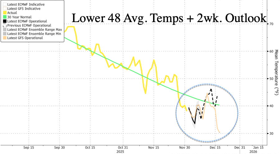 According to a report by ZeroHedge, natural gas futures are on track for their largest quarterly gain since the first quarter of 2022. Prices on Tuesday morning were trading near $5 per mmbtu, the highest level since December 2022. The rally is being fueled by a rapid shift toward colder early-December temperatures across the Midwest and East, which has boosted heating demand expectations.