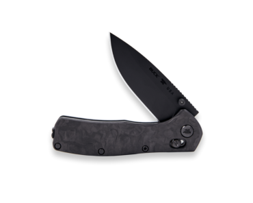 Prior flavors of Range Elite featured aluminum scales – an admirable choice to be sure, but not a showstopper material by and large. The Stealth Run Range Elite sports gold-threaded marbled carbon fiber scales and blacked out hardware instead. Speaking of hardware, the thumb stud is unique here as well, with a glow-in-the-dark tritium insert from Glow Rhino. Naturally this is a light and nimble piece with a listed weight of 3 oz.