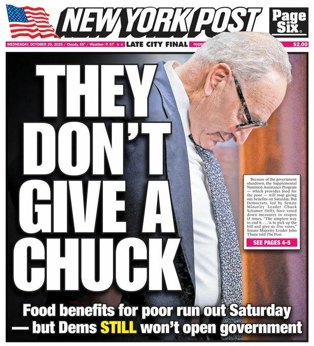 Democrats have spent a month playing with people’s livelihoods because the far-left wing of their party won’t let them accept a clean, nonpartisan CR. If they want to prevent damage from their shutdown, then they can end their shutdown. The bill is right there at the desk,” Senate Majority Leader John Thune wrote on X.