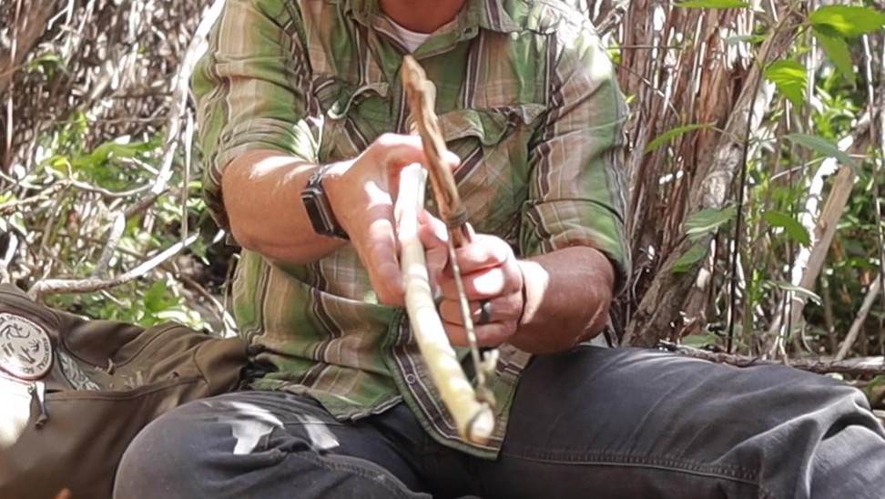 - String the Bow – For the primitive bow string, a leather thong was used when available. Leather was stretched tight because it is somewhat elastic. If you string the bow with a bootlace or modern cordage without much stretch, it will not need to be as tight. A trick I learned from David Holladay was that if you don’t have any cordage, you can tear the bottom seam from a t-shirt and braid cordage from that. You can also braid a string from plant fibers, rawhide, catgut or sinew. Tie the string loosely to the bow and then twist the spindle into place. It may take a couple of tries to get the tension right.