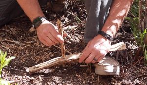 - Collect Materials – One could write an entire chapter just on bow drill materials and which species are suitable for bow drills or hand drill spindles or hearth boars. The main things that you need to know are that the wood can’t be too hard or it will glaze and never develop an ember, and that all materials should be bone dry. The materials for the hearth board, spindle, and bow can come from the same dead branch as long as the wood isn’t too hard and it is sufficiently dry.