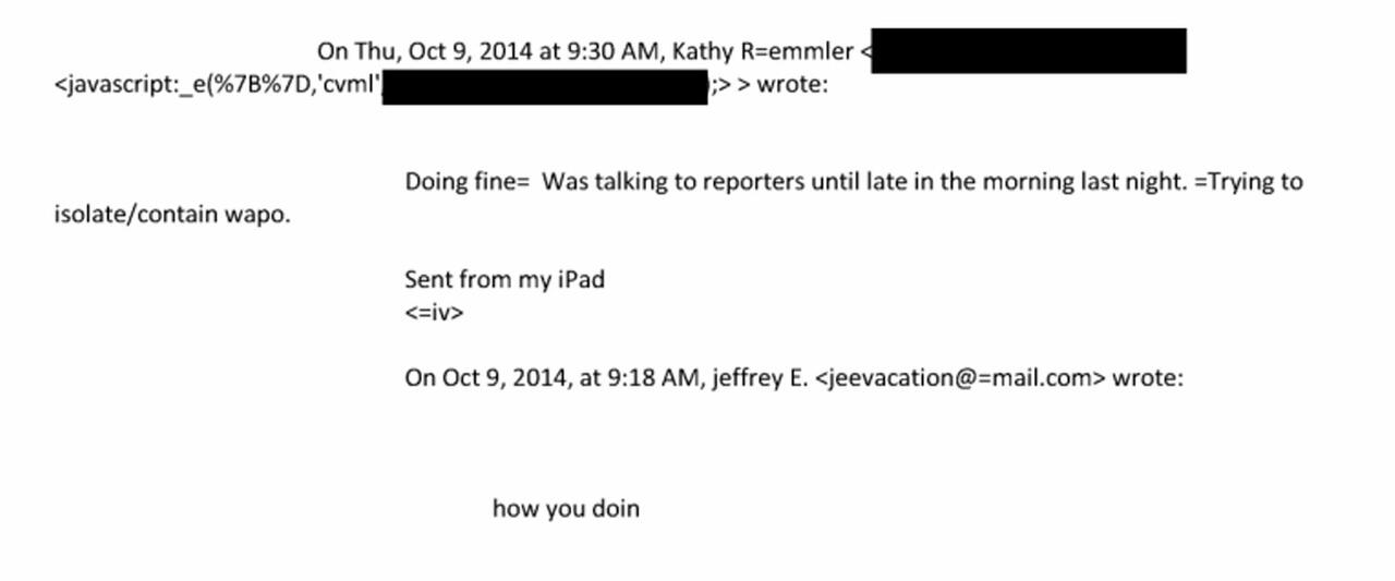On October 9, 2014, Epstein emailed Ruemmler: “Doing fine. Was talking to reporters until late in the morning last night. Trying to isolate/contain wapo.”