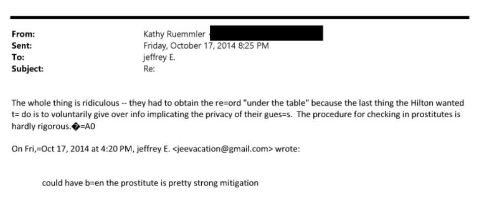 On October 17, 2014, Ruemmler forwarded Epstein a draft of her response to the Post reporter and asked for his input. In the draft, she downplayed the allegations, writing: