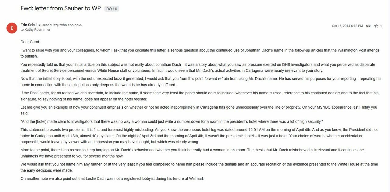 Finally, here is the letter that then-Obama White House Deputy Press Secretary Eric Schultz sent in coordination with Ruemmler, to Carol Leonnig who wrote the WaPo article exposing Jonathan Dach’s prostitution scandal, where they beg her to “from this point forward refrain from using Mr. Dach’s name,” as “He has served his purposes for your reporting—repeating his name in connection with these allegations only deepens the wounds he has already suffered.”