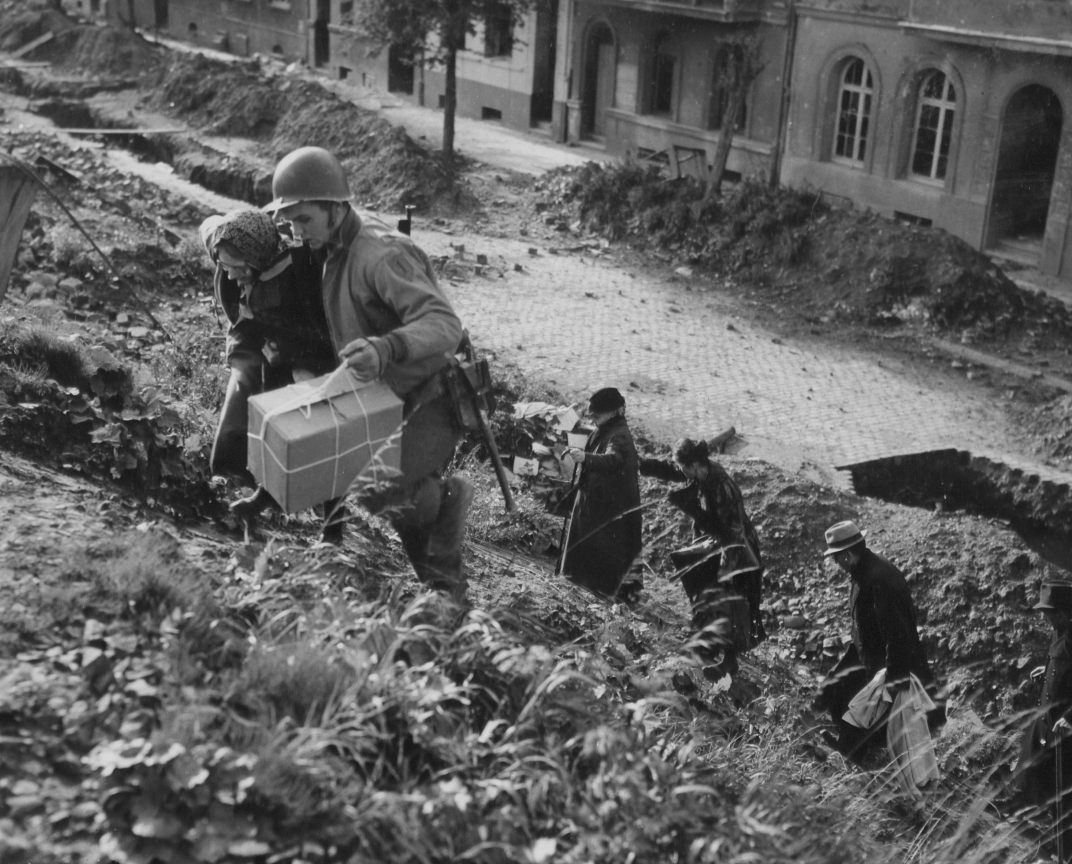 A U.S. soldier helps German civilians evacuate who had been shot at by Nazis earlier for trying to leave. (National Archives)