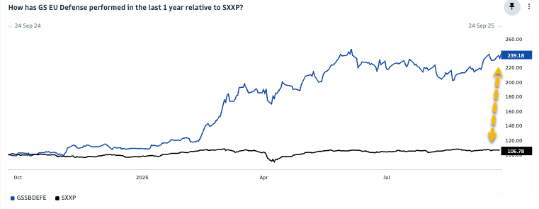 The GS EU Defense basket has widely outpaced the STOXX Europe 600 so far this year.